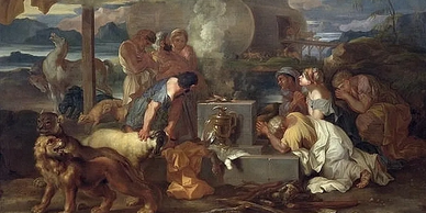 Noah performs a last-minute sacrifice to Yahweh in French Sebastien Bourdon's 1640's painting
